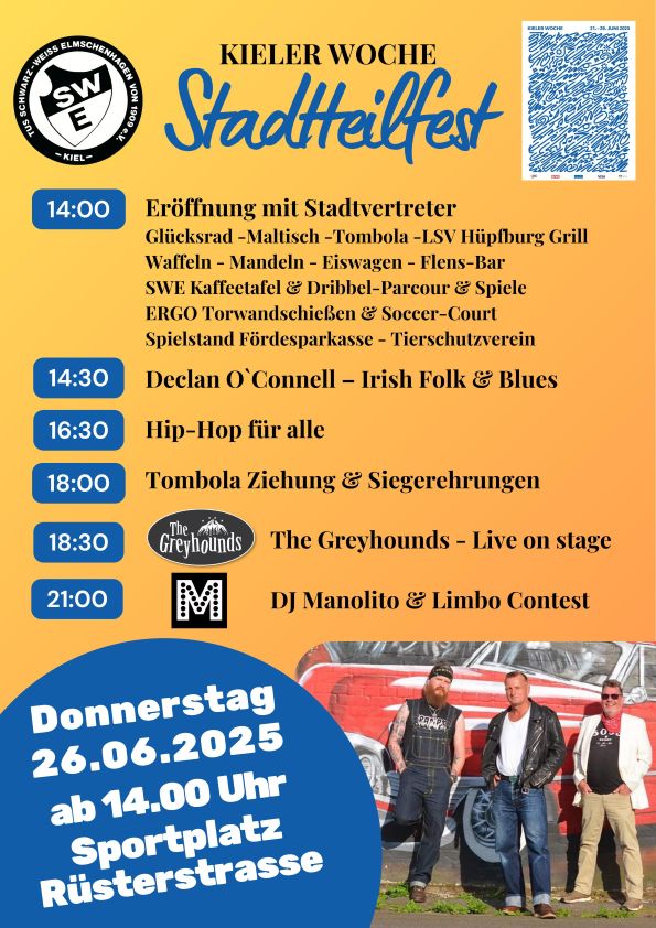 Das wird ein Stadtteilfest für alle Generationen: der traditionsreichste Sportverein im Stadtteil Elmschenhagen veranstaltet im Rahmen der Kieler Woche wieder mit Unterstützung durch das Kieler Woche Büro und zahlreichen Sponsoren das Elmschenhagener Stadtteilfest am Donnerstag, 26. Juni 2025, von 14 Uhr bis Mitternacht auf dem Sportplatz Rüsterstraße. Das Vereinsgelände ist auto- und barrierefrei, vom umlaufenden Zaun gut gesichert und durch das Seitentor vom Richtweg eben auch per Rollstuhl gut erreichbar.